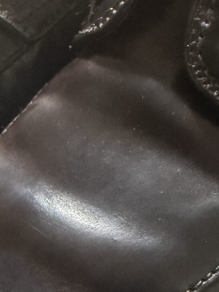 ブルームとは革の内部に含まれる油分やロウが、温度変化(特に寒さ)や保管環境によって革の表面に白い粉のように浮き出てくる現象を指します。