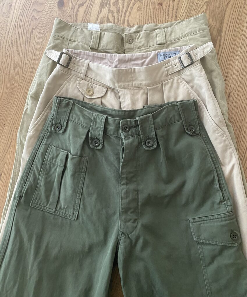 フランス以外の軍パンも混ざっていますが、定番の「M-52」は言わずもがな。イギリス陸軍「グルカパンツ」このサイドアジャストとフロントの仕様が機能的で男心をくすぐられます。現代では使われることのない機能性ですが。