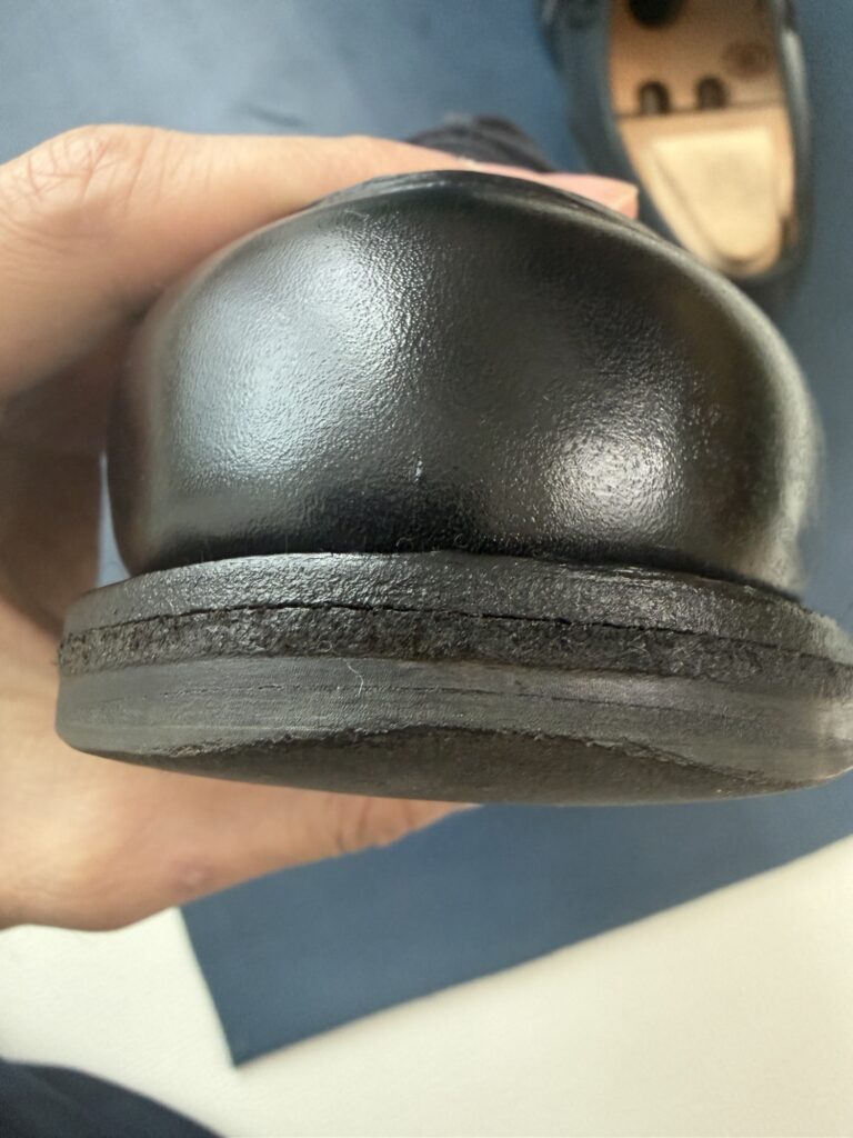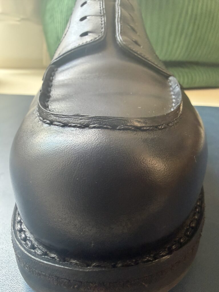 正面のほうがヴァンプの盛り上がりが分かるかと思いましたがそうでもないですね。小指側の革は足型に沿って広がってきました。